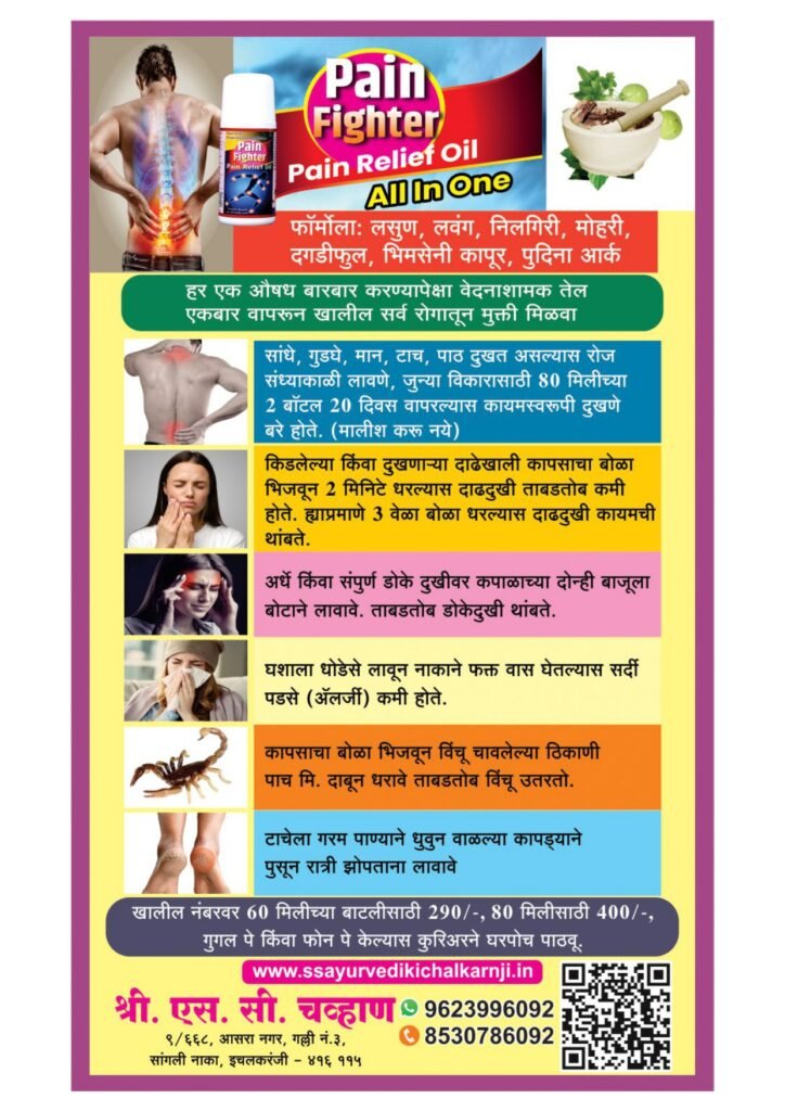 Welcome to S.S. Ayurvedalaya, your trusted partner in holistic healing through the power of Ayurveda. Located in Ichalkaranji, we specialize in providing Ayurvedic solutions crafted with care and precision to help you live a healthier and pain-free life. Explore our wide range of products, including Pain Fighter Oil, Sanjeevan Churna, and more, designed to target your everyday health needs naturally and effectively.